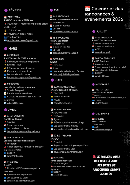 Le bureau du CDTE29 se réunira le vendredi 19 septembre 2025 après la journée de formation balisage aux Chevaux de Toul Ar C'Hoat à Saint Yvi.